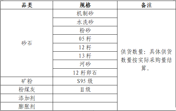 本次征集活動(dòng)為2024年度第一次原材料供應商的征集,征集供應商品類(lèi)為:砂石、水泥、粉煤灰、礦粉、膨脹劑、減水劑、外加劑等,現每年總需求約200萬(wàn)噸。